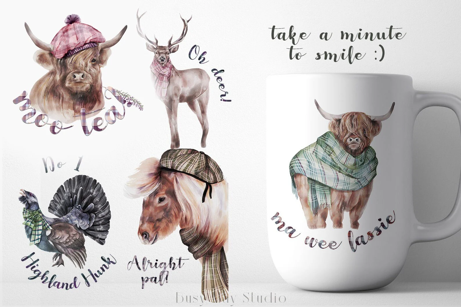 This set features most common Scottish animals and birds – red deer, Shetland pony, Highland cow (coo!), sand piper and some others. They come 4 ways: just the animals; animals decorated with flowers; animals dressed in tartan accessories and animals combined with some humorous Scottish sayings which hopefully put a little smile on your face! 🙂